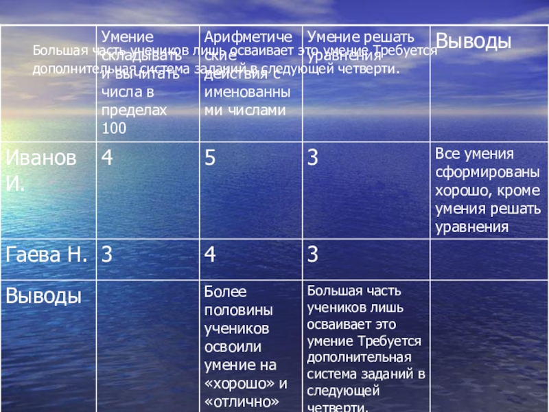 по классу в целом. Сделать вывод о том, какие умения развиты хорошо, а какие требуют дальнейшего развития.
