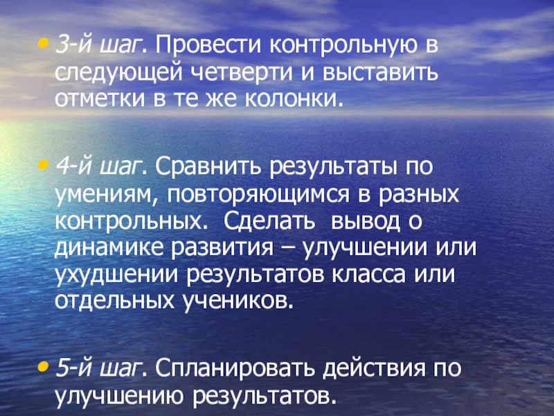4-й шаг. Сравнить результаты по умениям, повторяющимся в разных контрольных. Сделать вывод о динамике развития – улучшении или ухудшении результатов класса или отдельных учеников.