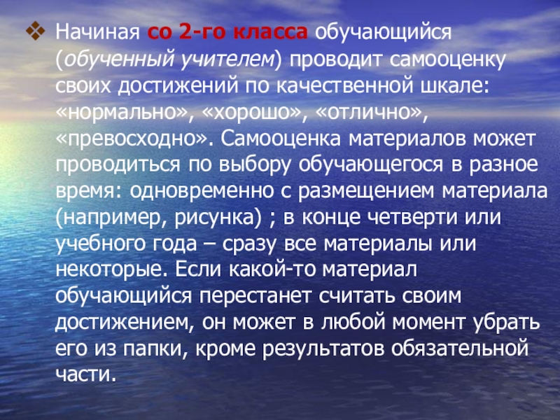 по качественной шкале: «нормально», «хорошо», «отлично», «превосходно». Самооценка материалов может проводиться по выбору обучающегося в разное время: одновременно с размещением материала (например, рисунка) ; в конце четверти или учебного года – сразу все материалы или некоторые. Если какой-то материал обучающийся перестанет считать своим достижением, он может в любой момент убрать его из папки, кроме результатов обязательной части.