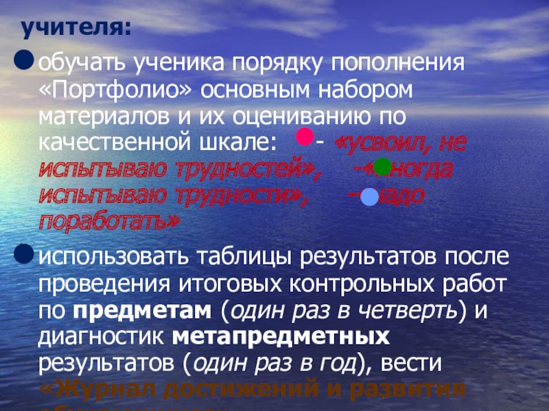 обучать ученика порядку пополнения «Портфолио» основным набором материалов и их оцениванию