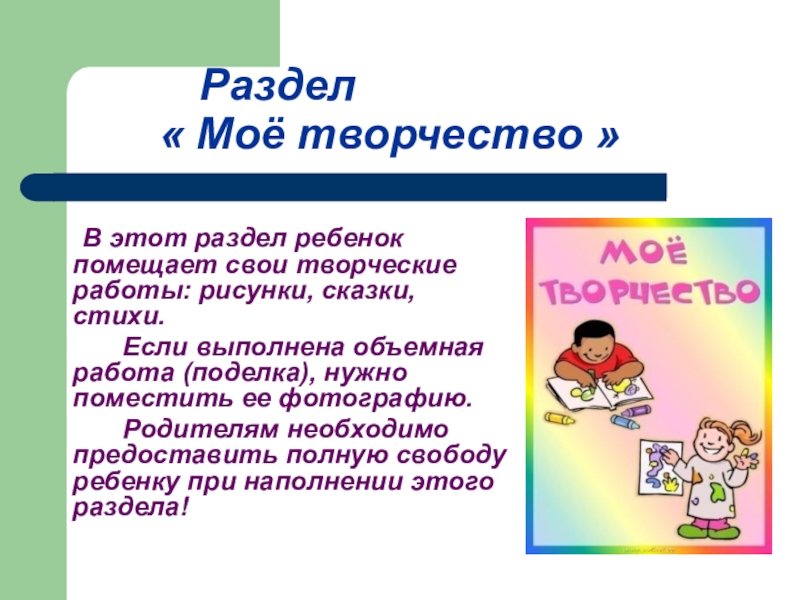 Родителям необходимо предоставить полную свободу ребенку при наполнении этого раздела!