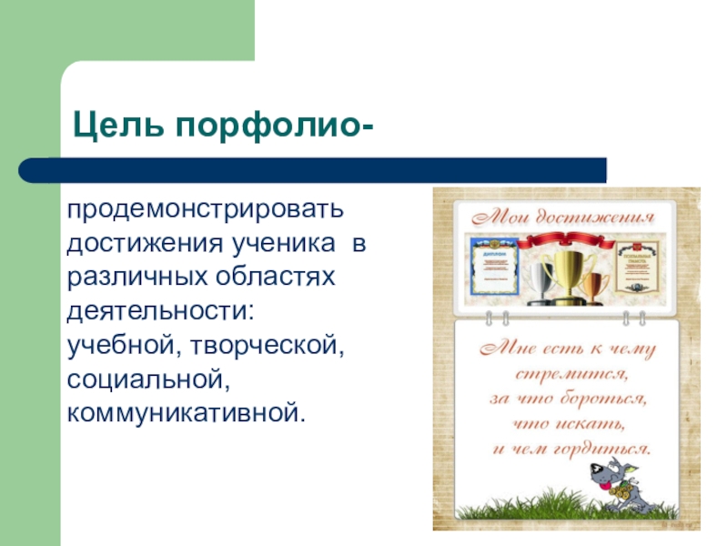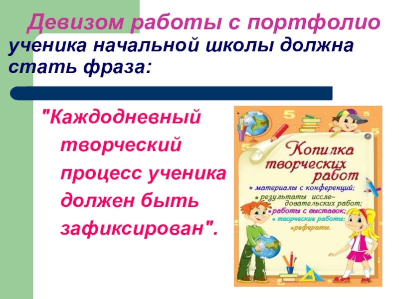 Слайд 9 Девизом работы с портфолио ученика начальной школы должна стать фраза: