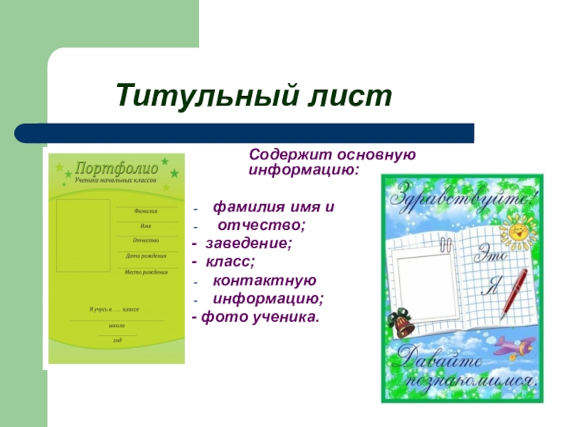 школьному предмету. Ученик наполняет этот раздел удачно написанными контрольными работами, интересными проектами, отзывами о прочитанных книгах, графиками роста скорости чтения, творческими работами.