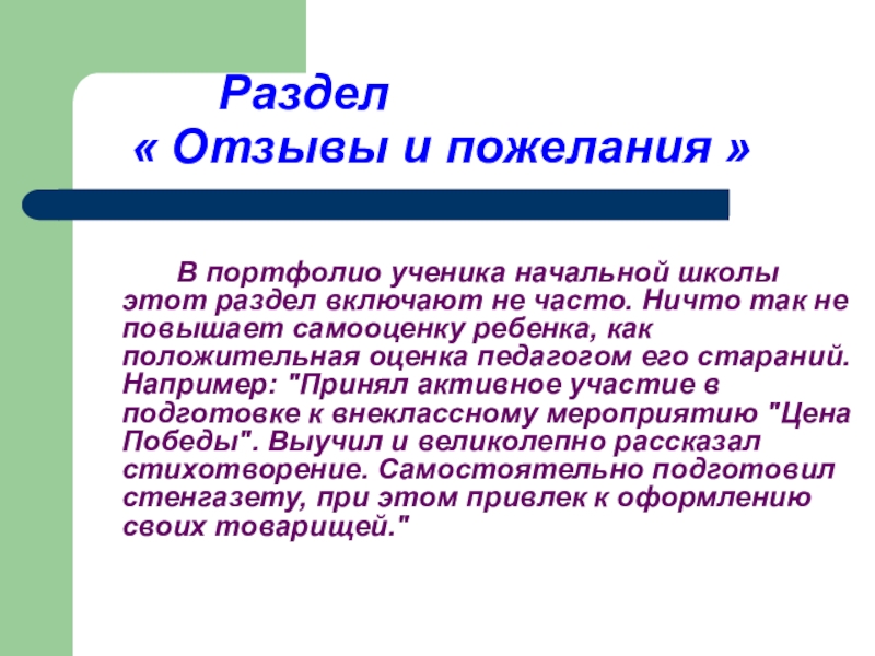 раздел включают не часто. Ничто так не повышает самооценку ребенка, как положительная оценка педагогом его стараний. Например: "Принял активное участие в подготовке к внеклассному мероприятию "Цена Победы". Выучил и великолепно рассказал стихотворение. Самостоятельно подготовил стенгазету, при этом привлек к оформлению своих товарищей."