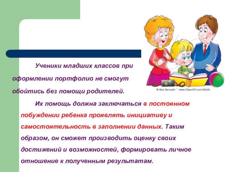 Старайтесь с самого начала построить работу ребенка таким образом, чтобы он сам прикладывал определенные усилия к формированию портфолио.