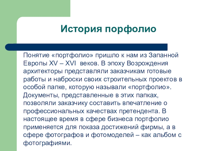 XVI веков. В эпоху Возрождения архитекторы представляли заказчикам готовые работы и наброски своих строительных проектов в особой папке, которую называли «портфолио». Документы, представленные в этих папках, позволяли заказчику составить впечатление о профессиональных качествах претендента. В настоящее время в сфере бизнеса портфолио применяется для показа достижений фирмы, а в сфере фотографов и фотомоделей – как альбом с фотографиями.