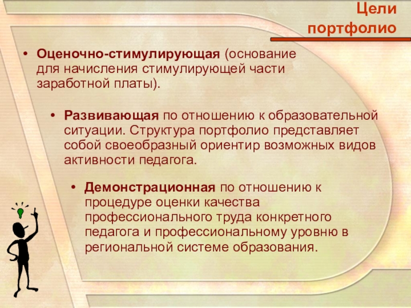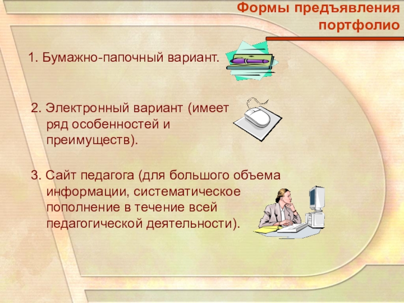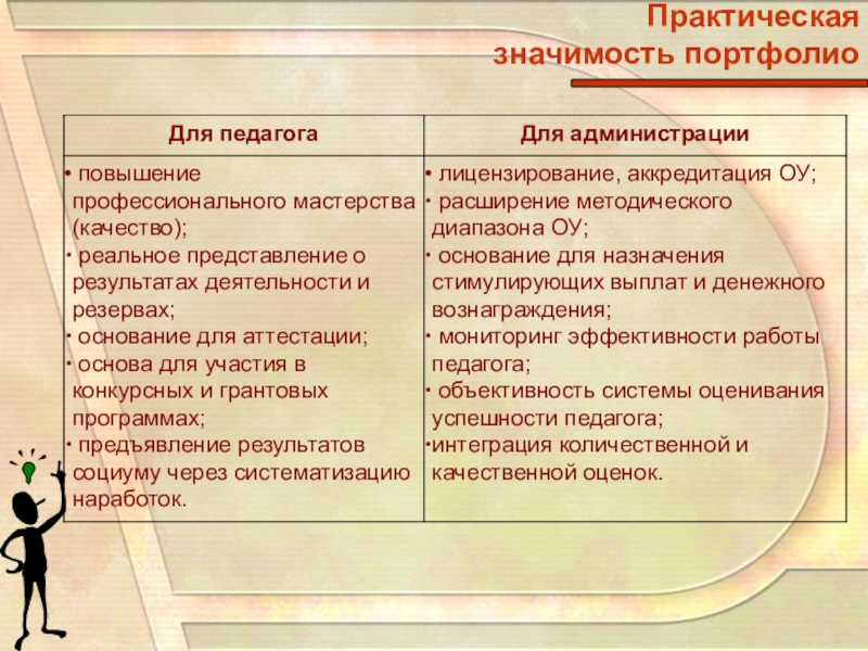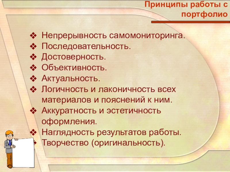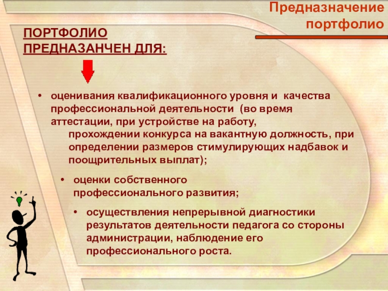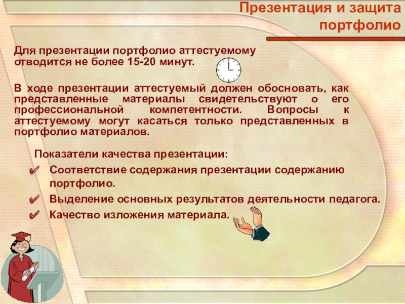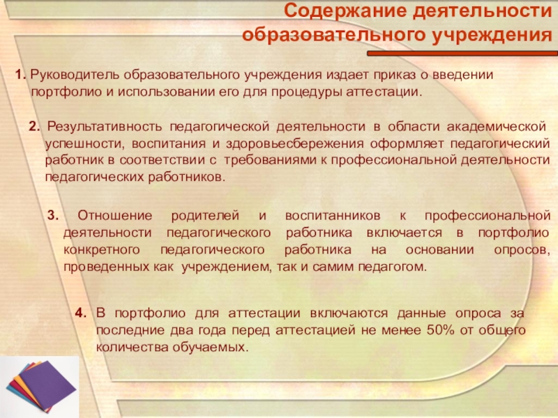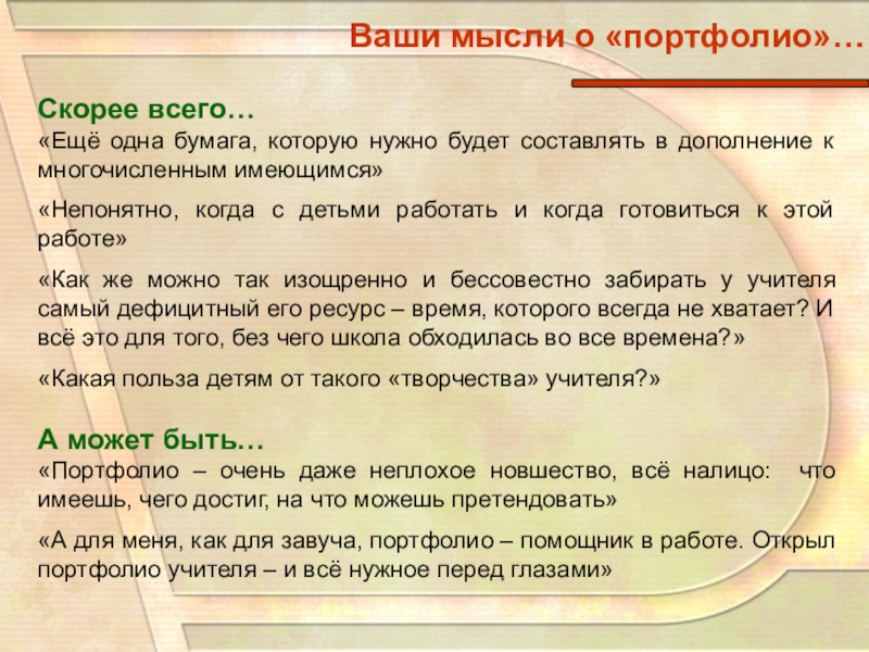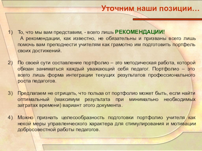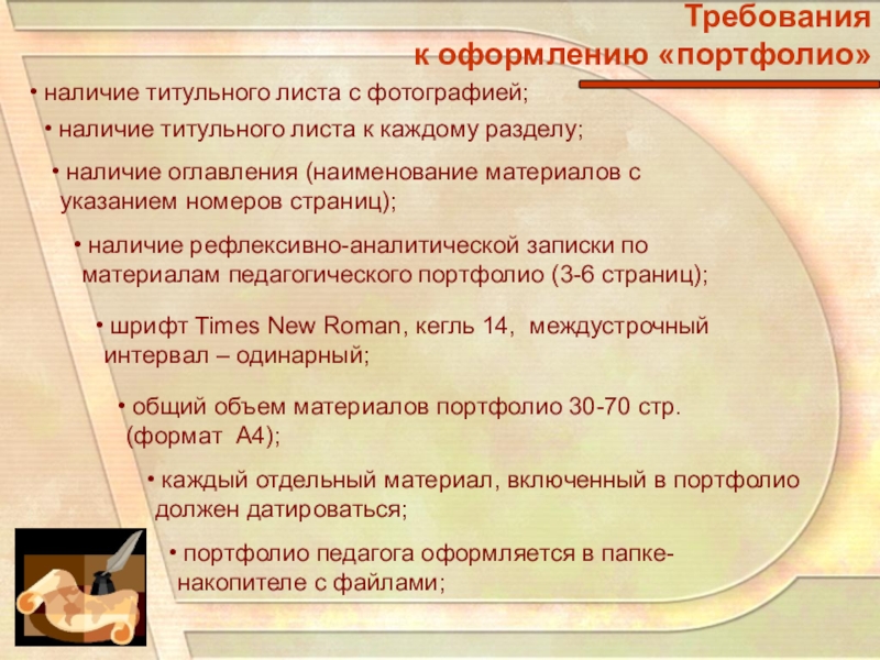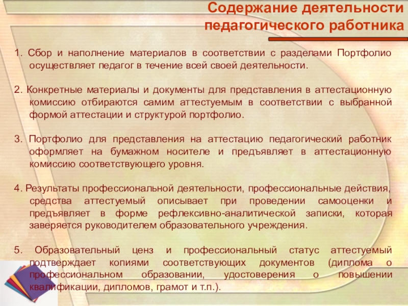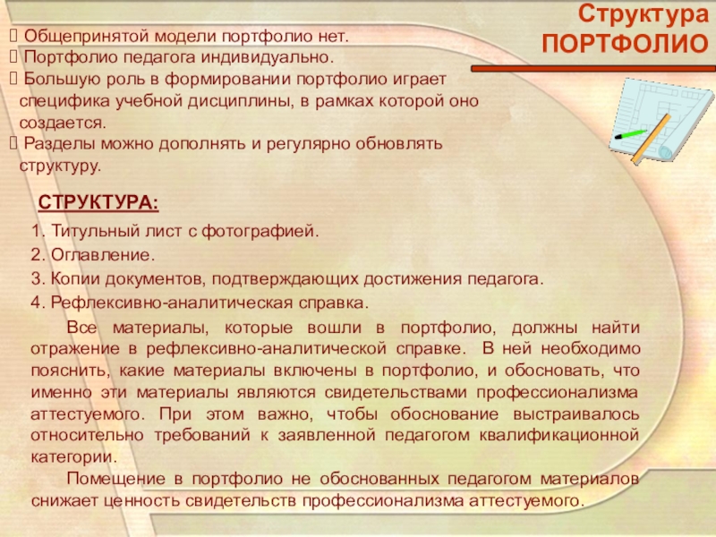 Помещение в портфолио не обоснованных педагогом материалов снижает ценность свидетельств профессионализма аттестуемого.