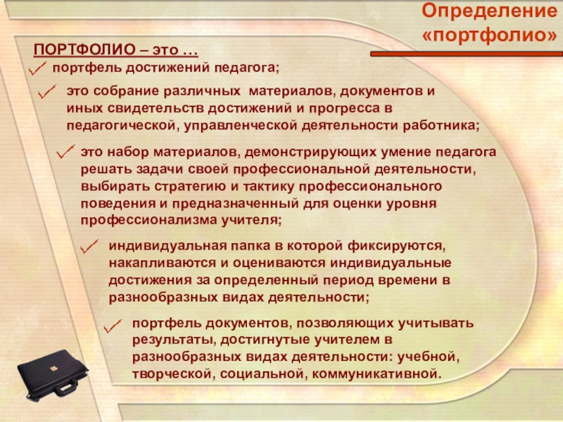 портфель документов, позволяющих учитывать результаты, достигнутые учителем в разнообразных видах деятельности: учебной, творческой, социальной, коммуникативной.