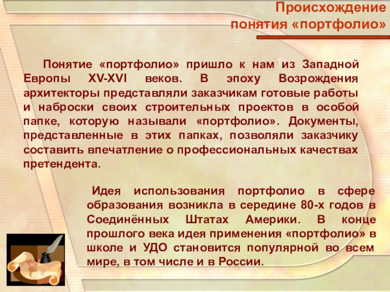 Идея использования портфолио в сфере образования возникла в середине 80-х годов в Соединённых Штатах Америки. В конце прошлого века идея применения «портфолио» в школе и УДО становится популярной во всем мире, в том числе и в России.
