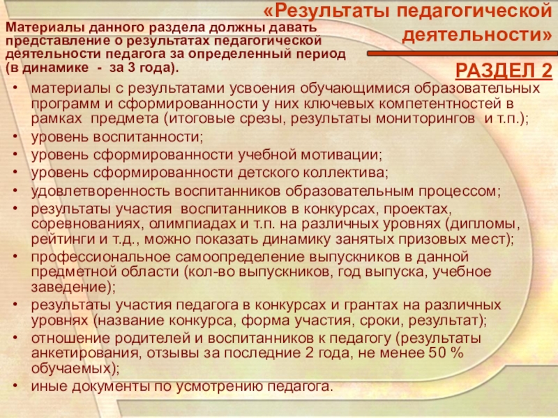 Материалы данного раздела должны давать представление о результатах педагогической деятельности педагога за определенный период (в динамике - за 3 года).
