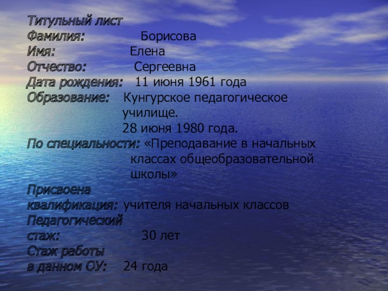 Титульный лист Фамилия: Борисова Имя: Елена Отчество: Сергеевна Дата рождения: 11 июня 1961 года Образование: Кунгурское
