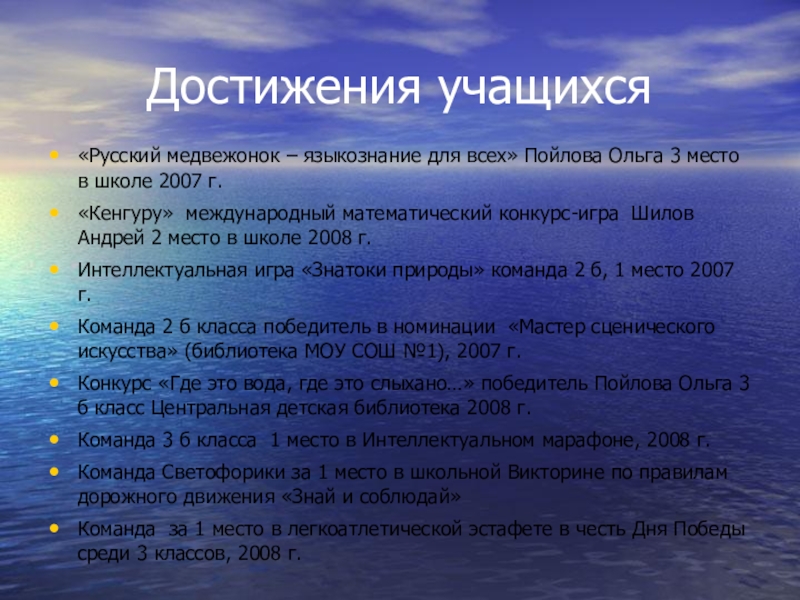 Достижения учащихся«Русский медвежонок – языкознание для всех» Пойлова Ольга 3 место в школе 2007 г.«Кенгуру» международный математический