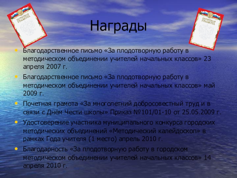 НаградыБлагодарственное письмо «За плодотворную работу в методическом объединении учителей начальных классов» 23 апреля 2007 г.Благодарственное письмо «За