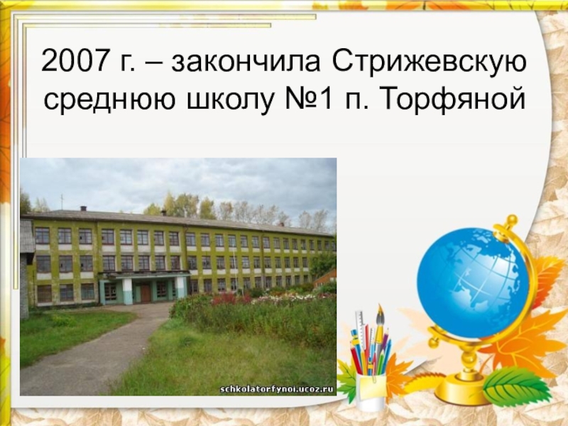 Слайд 22007 г. – закончила Стрижевскую среднюю школу №1 п. Торфяной