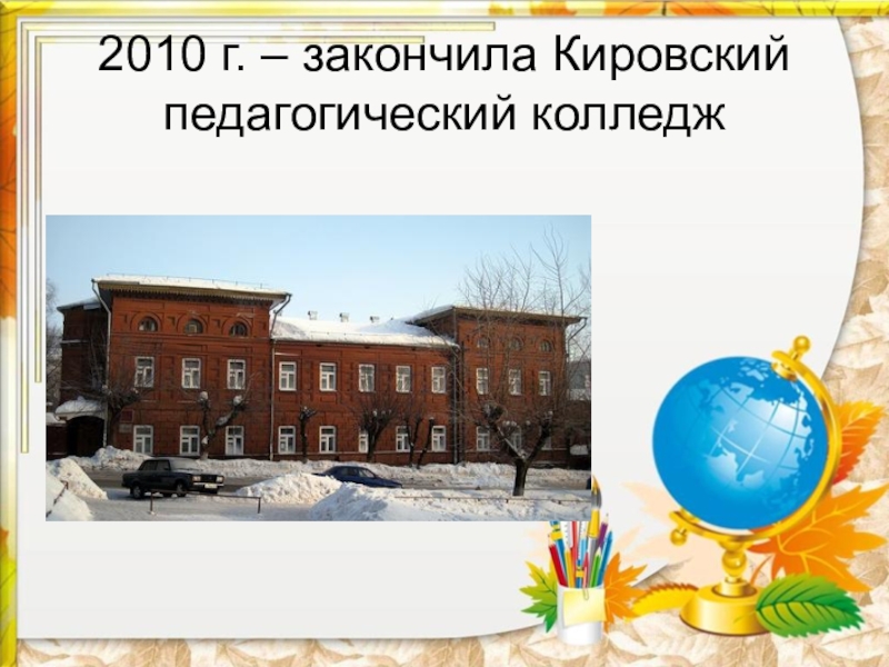 Слайд 32010 г. – закончила Кировский педагогический колледж
