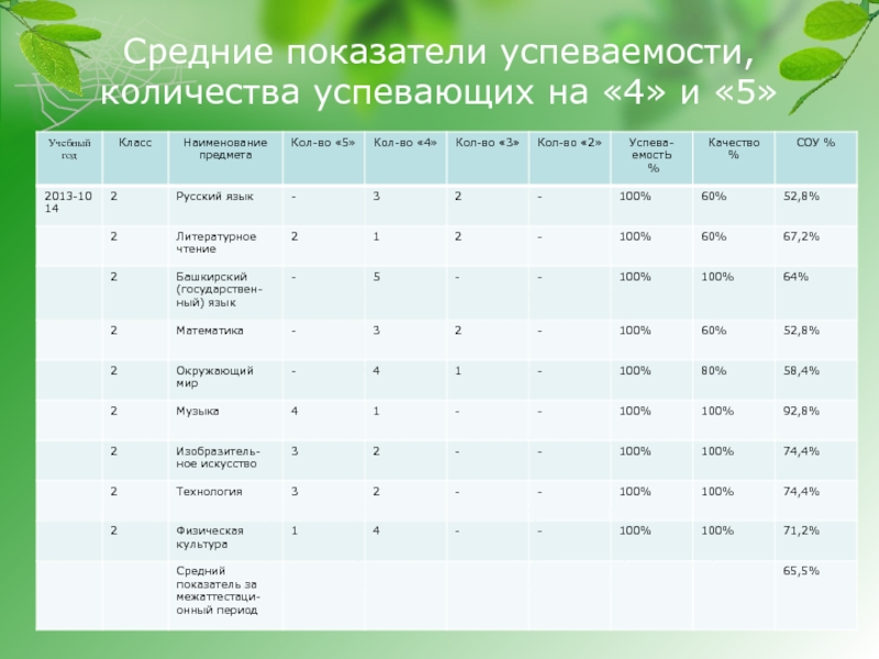 Слайд 7Средние показатели успеваемости, количества успевающих на «4» и «5»