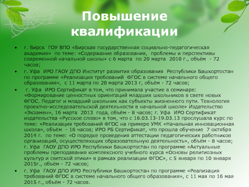 г. Уфа ИРО Сертификат в том, что принимала участие в семинаре: «Формирование ценностных ориентаций младших школьников в свете новых ФГОС. Педагог и младший школьник как субъекты жизненного пути. Технология проектно-исследовательской деятельности в начальной школе» Издательство «Экзамен», 16 марта 2013 года, объём - 8 часов; г. Уфа ИРО Сертификат издательства «Русское слово» в том, что с 18.03.13-19.03.13 прослушала курс по теме: «Реализация требований ФГОС на примере УМК «Начальная инновационная школа», объём - 16 часов; ИРО РБ Сертификат, что прошла обучение 7 октября 2014 г. по теме: «О порядке проведения аттестации педагогических работников организаций, осуществляющих образовательную деятельность», объём - 8 часов; г. Уфа ГАОУ ДПО ИРО Республики Башкортостан по программе «Актуальные проблемы преподавания комплексного учебного курса «Основы религиозных культур и светской этики» в рамках реализации ФГОС», с 5 января по 10 января 2015г., объём - 72 часов;