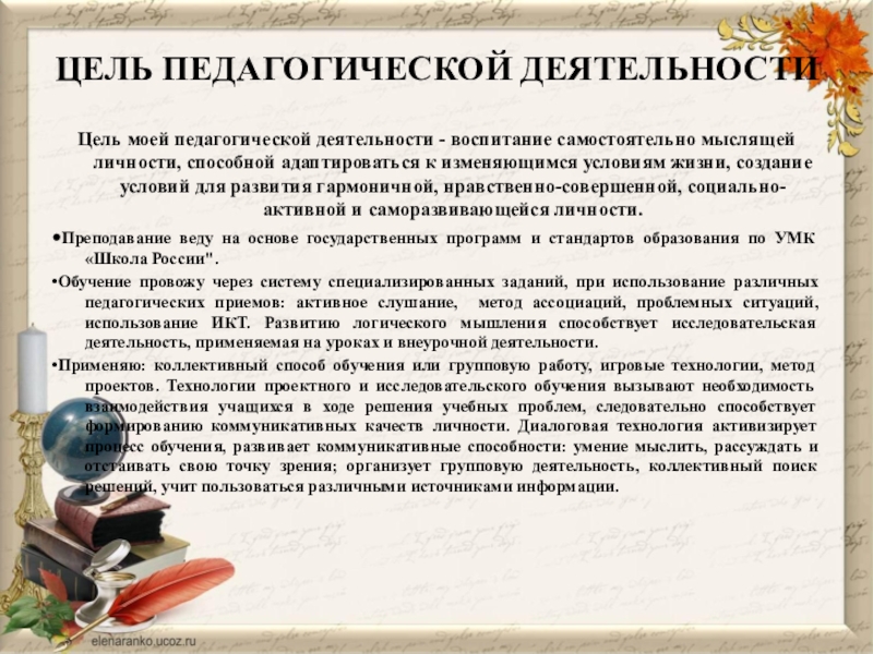 Цель моей педагогической деятельности - воспитание самостоятельно мыслящей личности,