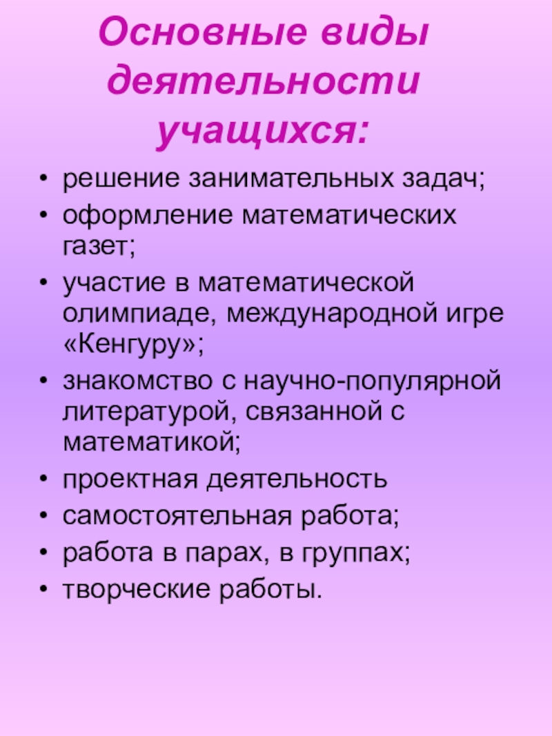 Слайд 40Основные виды деятельности учащихся: