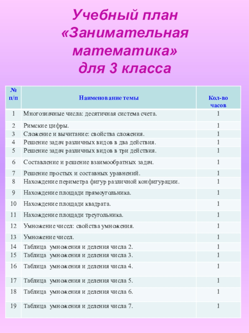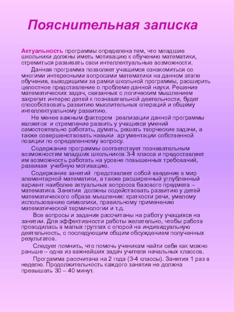 Содержание занятий представляет собой введение в мир элементарной математики, а также расширенный углубленный вариант наиболее актуальных вопросов базового предмета – математика. Занятия должны содействовать развитию у детей математического образа мышления: краткости речи, умелому использованию символики, правильному применению математической терминологии и т.д.
