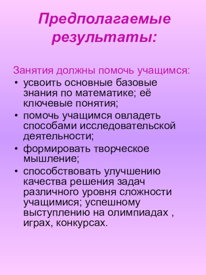 Во-первых, развитие интереса к математике как науке физико-математического направления, во-вторых, успешное усвоение учебного материала на уроках и выступление на олимпиадах по математике.