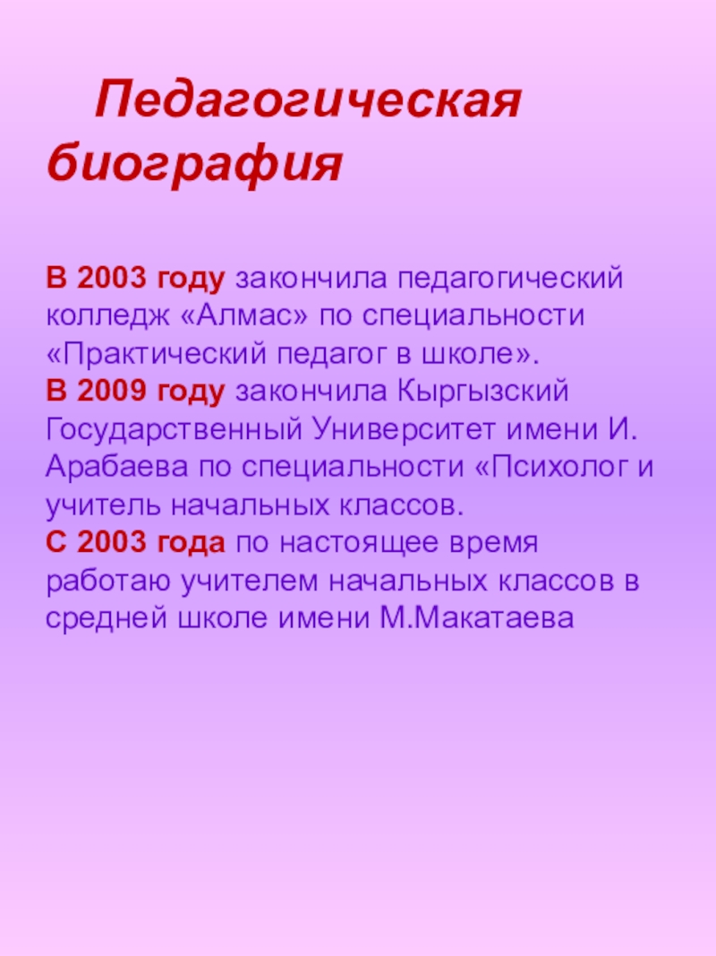 С 2003 года по настоящее время работаю учителем начальных классов в средней школе имени М.Макатаева