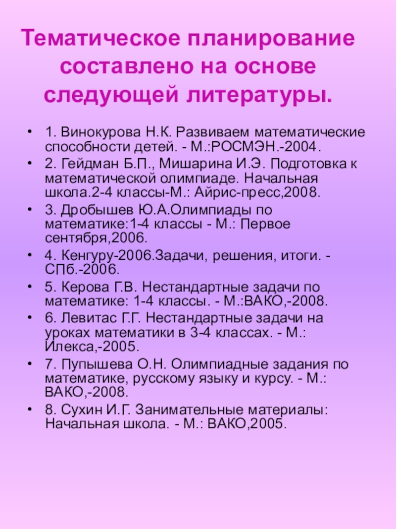 Слайд 41Тематическое планирование составлено на основе следующей литературы.