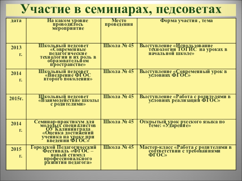 участие в педсоветах, семинарах