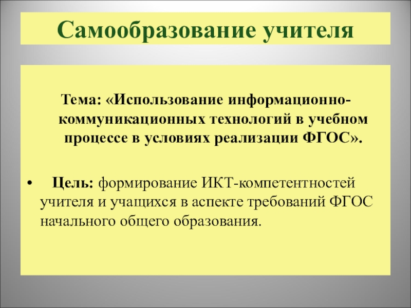 Цель: формирование ИКТ-компетентностей учителя и учащихся в аспекте требований ФГОС начального общего образования.