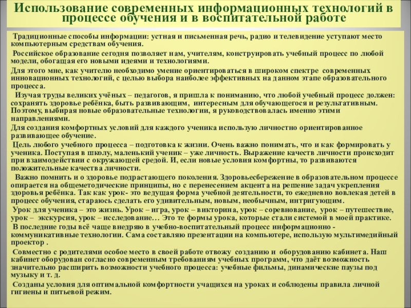 В последние годы всё чаще внедряю в учебно-воспитательный процесс информационно - коммуникативные технологии. Сама составляю презентации на компьютере, использую мультимедийный проектор .