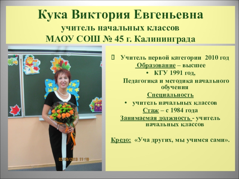 Детские шалости, проказы, а иногда и дерзость она встречала по-матерински, терпеливо разъясняя детям их ошибки, воспитывая в них лучшие человеческие, нравственные качества. Наш первый учитель Кука Виктория Евгеньевна есть и остается для наших детей примером и образцом Человека.