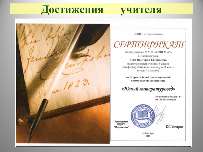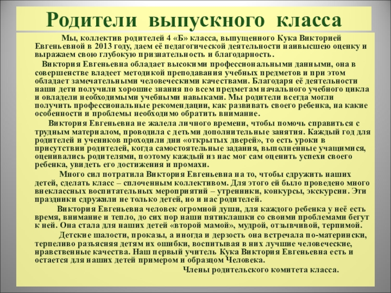 Мы, коллектив родителей 4 «Б» класса, выпущенного Кука Викторией Евгеньевной в 2013 году, даем её педагогической деятельности наивысшею оценку и выражаем свою глубокую признательность и благодарность.