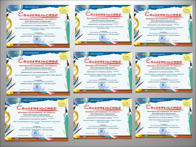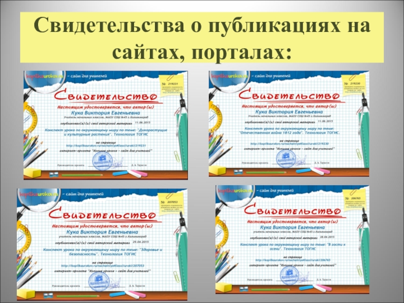 Слайд 15Свидетельства о публикациях на сайтах, порталах: