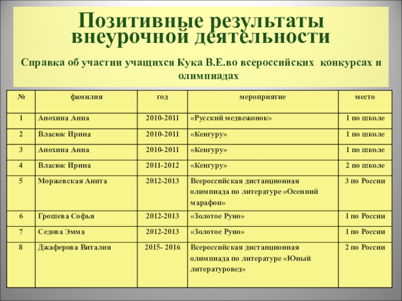 Справка об участии учащихся Кука В.Е.во всероссийских конкурсах