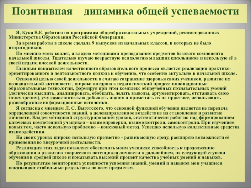 Я согласна с мнением Л. С. Выготского, что основной функцией обучения является не передача определенной совокупности знаний, а целенаправленное воздействие на становление и развитие личности. Владея методикой структурирования уроков, систематически работаю над формированием ключевых компетенций учащихся – взаимопроверки, взаимоконтроля, самоконтроля. При изучением новых тем, часто использую проблемно – поисковый метод. Успешно использую коллективные средства взаимодействия.