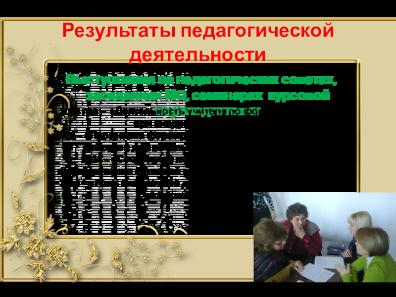 Выступления на педагогических советах, заседаниях МО, семинарах курсовой переподготовки