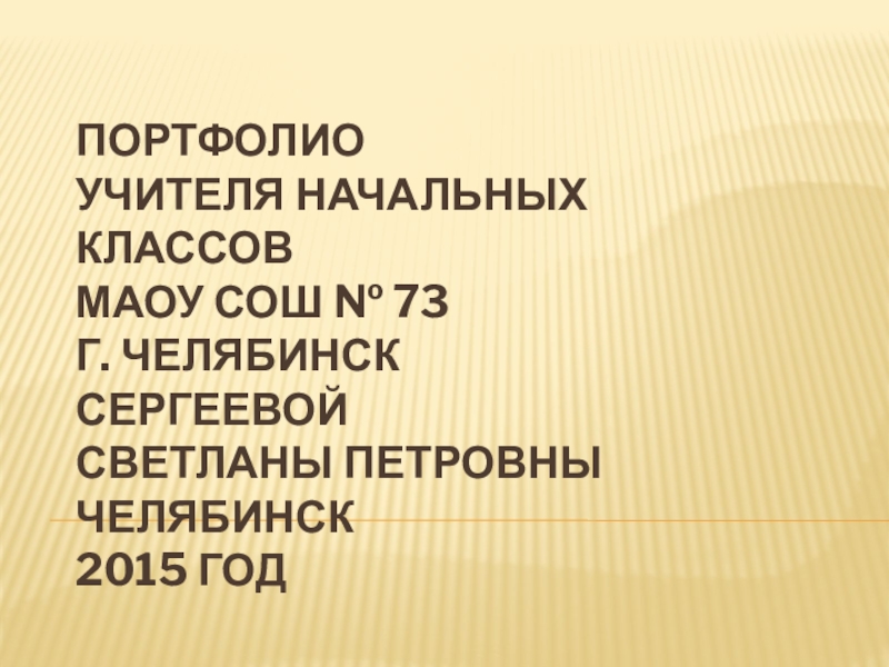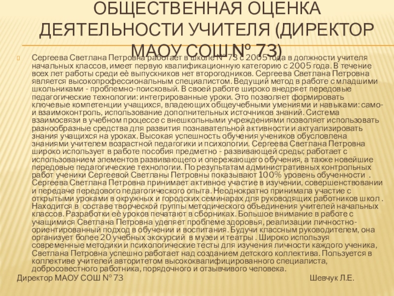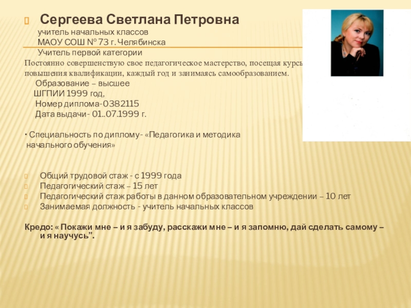 работает в школе № 73 с 2005 года в должности учителя начальных классов, имеет первую квалификационную категорию с 2005 года. В течение всех лет работы среди еѐ выпускников нет второгодников. Сергеева Светлана Петровна является высокопрофессиональным специалистом. Ведущий метод в работе с младшими школьниками - проблемно-поисковый. В своей работе широко внедряет передовые педагогические технологии: интегрированные уроки. Это позволяет формировать ключевые компетенции учащихся, владеющих общеучебными умениями и навыками: само- и взаимоконтроль, использование дополнительных источников знаний. Система взаимосвязи в учебном процессе с внешкольными учреждениями позволяет использовать разнообразные средства для развития познавательной активности и актуализировать знания учащихся на уроках. Высокая успешность обучения учеников обусловлена знаниями учителем возрастной педагогики и психологии. Сергеева Светлана Петровна широко использует в работе пособия предметно - развивающей среды; работает с использованием элементов развивающего и опережающего обучения, а также новейшие передовые педагогические технологии. По результатам административных контрольных работ ученики Сергеевой Светланы Петровны показывают 100% уровень обученности . Сергеева Светлана Петровна принимает активное участие в изучении, совершенствовании и передаче передового педагогического опыта. Неоднократно принимала участие с открытыми уроками в окружных и городских семинарах для руководящих работников школ . Находится в составе творческой группы методического объединения учителей начальных классов. Разработки еѐ уроков печатают в сборниках. Большое внимание в работе с учащимися Светлана Петровна уделяет проблеме здоровья, реализации личностно- ориентированный подход в обучении и воспитания. Будучи классным руководителем, она организует более 20 учебных экскурсий в музеи и театры . Широко используя современные методики и психологические тесты для изучения личности каждого ученика, Светлана Петровна успешно работает над созданием детского коллектива. Пользуется в коллективе учителей авторитетом высококвалифицированного специалиста, добросовестного работника, порядочного и отзывчивого человека.