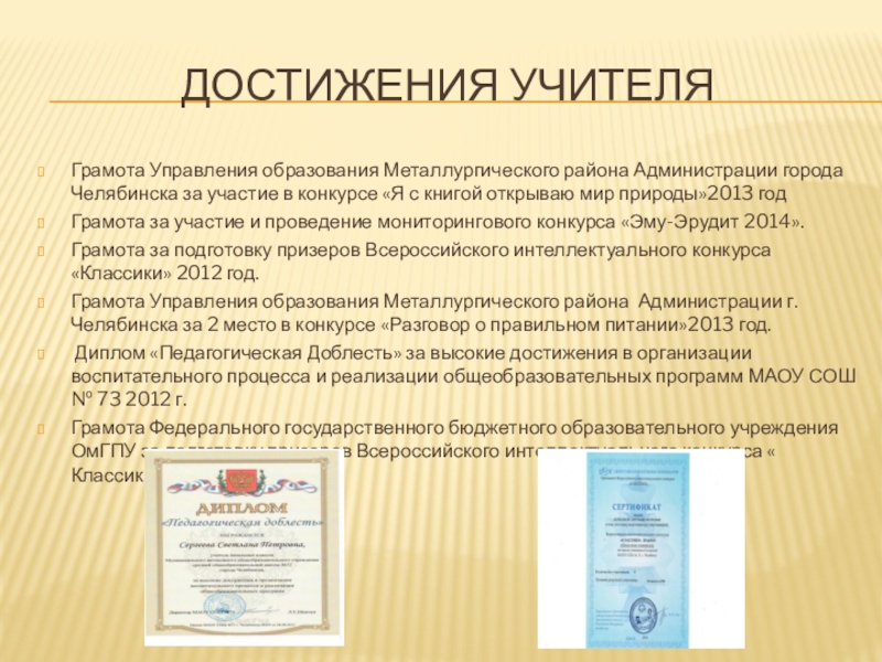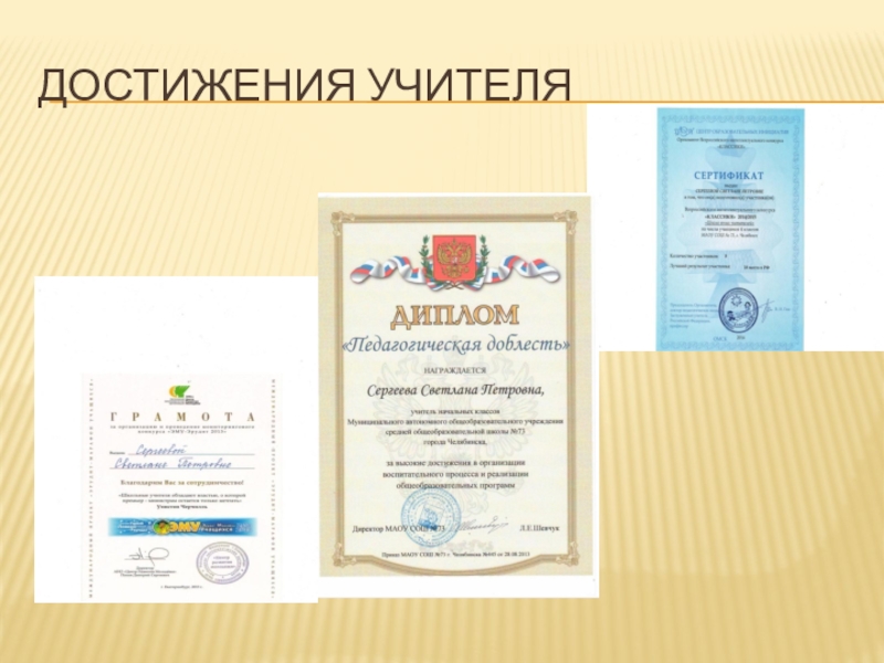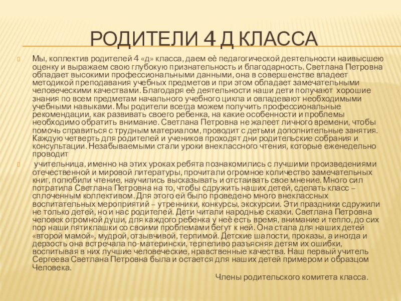 педагогической деятельности наивысшею оценку и выражаем свою глубокую признательность и благодарность. Светлана Петровна обладает высокими профессиональными данными, она в совершенстве владеет методикой преподавания учебных предметов и при этом обладает замечательными человеческими качествами. Благодаря еѐ деятельности наши дети получают хорошие знания по всем предметам начального учебного цикла и овладевают необходимыми учебными навыками. Мы родители всегда можем получить профессиональные рекомендации, как развивать своего ребенка, на какие особенности и проблемы необходимо обратить внимание. Светлана Петровна не жалеет личного времени, чтобы помочь справиться с трудным материалом, проводит с детьми дополнительные занятия. Каждую четверть для родителей и учеников проходят дни родительские собрания и консультации. Незабываемыми стали уроки внеклассного чтения, которые еженедельно проводит
