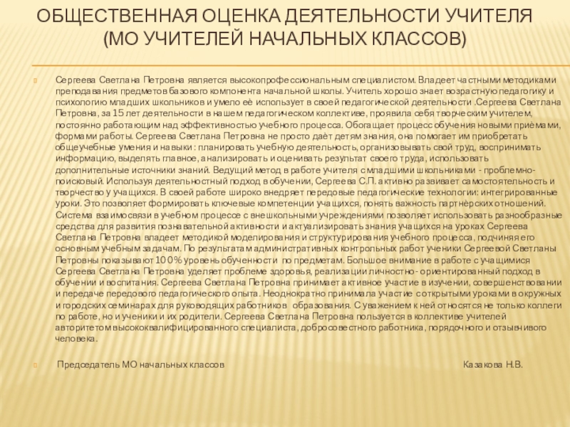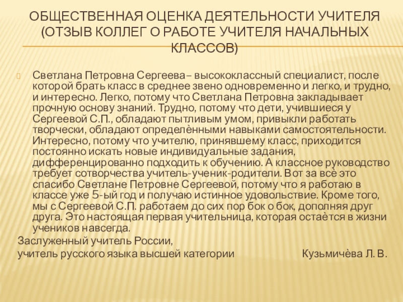 Слайд 29Общественная оценка деятельности учителя (Отзыв коллег о работе учителя начальных классов)