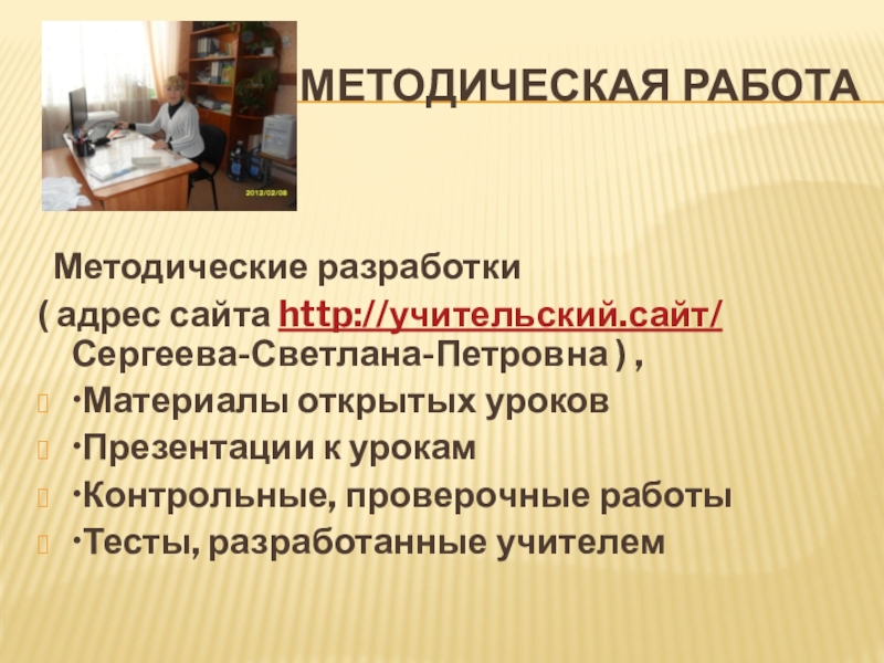 образования с 1999 года, всегда принимает активное участие в решении вопросов общественной жизни педагогического коллектива школы. Сергеева С.П.– высокопрофессиональный специалист. Учитель изучает методические новинки в сфере образования, передовые педагогические технологии, постоянно внедряет их в организацию учебного процесса. Владеет методикой модулирования и структурирования уроков. Грамотно используя педагогический опыт и мастерство, Сергеева С.П. помогает ученикам раскрывать свои таланты и способности. Кропотливо работает над созданием детского коллектива. Еѐ учеников отличает высокий уровень знаний и человеческая доброта. Сергеева С.П. систематически даѐт открытые уроки, выступает на методических советах, педагогических советах, участвует в окружных семинарах для учителей и директоров школ . Сергеева С.П. честный человек, пользуется у коллег репутацией высокопрофессионального специалиста и добросовестного работника. К Сергеевой С.П. всегда можно обратиться за профессиональным и жизненным советом. С уважением к ней относятся не только коллеги по работе, но и ученики и их родители.