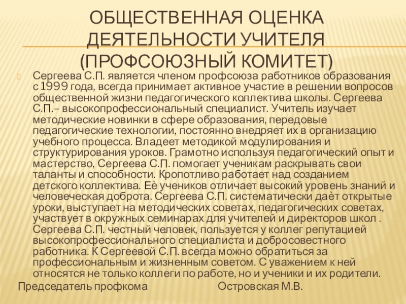 Слайд 28Общественная оценка деятельности учителя (Профсоюзный комитет)