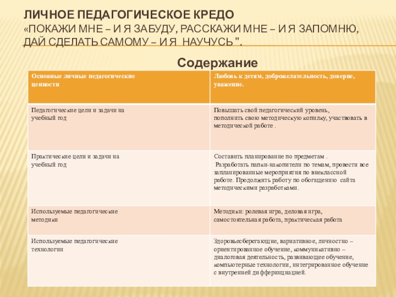 Кредо: « Покажи мне – и я забуду, расскажи мне – и я запомню, дай сделать самому – и я научусь”.
