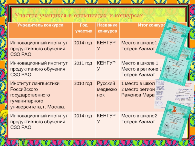 Слайд 41 Участие учащихся в олимпиадах и конкурсах