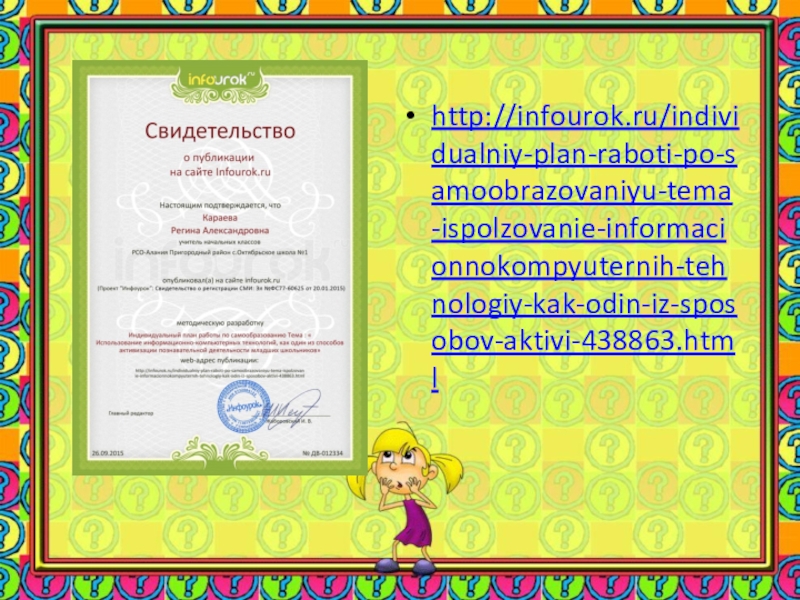 Слайд 17http://infourok.ru/individualniy-plan-raboti-po-samoobrazovaniyu-tema-ispolzovanie-informacionnokompyuternih-tehnologiy-kak-odin-iz-sposobov-aktivi-438863.html