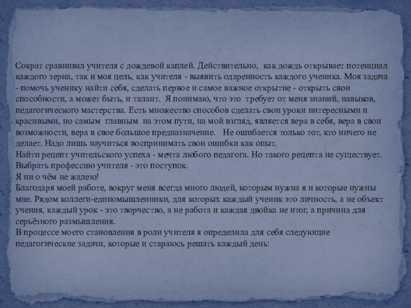 Слайд 12Сокрaт сравнивал учителя с дождевой каплей. Действительно, как дождь открывает потенциал