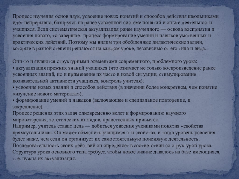 идет непрерывно, базируясь на ранее усвоенной системе понятий и опыте деятельности учащихся. Если систематическая актуализация ранее изученного — основа восприятия и усвоения нового, то завершает процесс формирование умений и навыков умственных и практических действий. Поэтому мы видим три обобщенные дидактические задачи, которые в разной степени решаются на каждом уроке, независимо от его типа и вида.