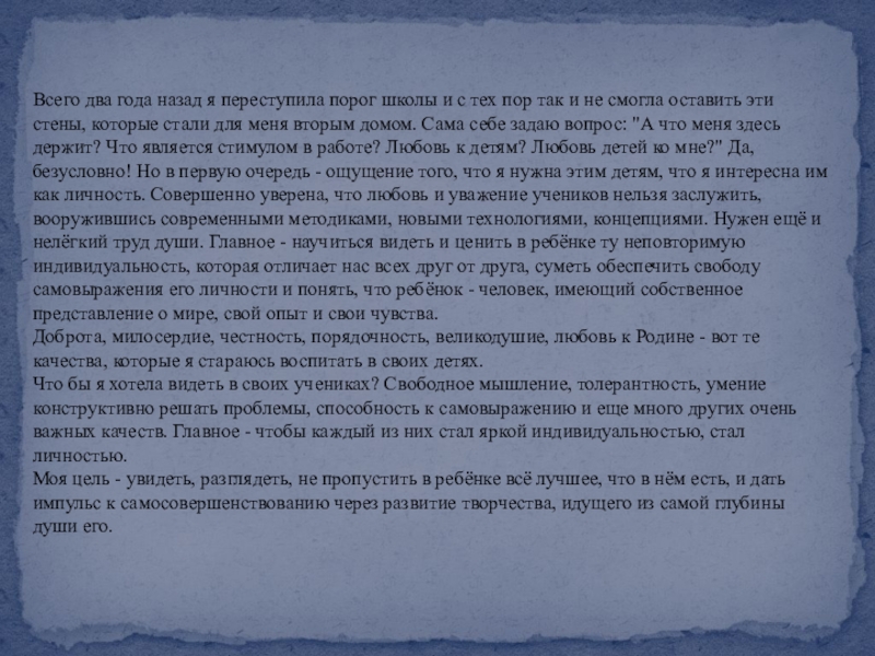 пор так и не смогла оставить эти стены, которые стали для меня вторым домом. Сама себе задаю вопрос: "А что меня здесь держит? Что является стимулом в работе? Любовь к детям? Любовь детей ко мне?" Да, безусловно! Но в первую очередь - ощущение того, что я нужна этим детям, что я интересна им как личность. Совершенно уверена, что любовь и уважение учеников нельзя заслужить, вооружившись современными методиками, новыми технологиями, концепциями. Нужен ещё и нелёгкий труд души. Главное - научиться видеть и ценить в ребёнке ту неповторимую индивидуальность, которая отличает нас всех друг от друга, суметь обеспечить свободу самовыражения его личности и понять, что ребёнок - человек, имеющий собственное представление о мире, свой опыт и свои чувства.
