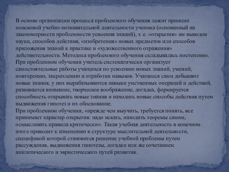 При проблемном обучении, «прежде чем выучить, требуется понять, все принимает характер открытия: надо искать, находить теоремы самим, осмысливать правила критически». Такая учебная деятельность в конечном итоге приводит к изменению в структуре мыслительной деятельности, спецификой которой становится решение учебной проблемы путем рассуждения, выдвижения гипотезы, догадки или же сочетанием аналитического и эвристического путей развития.