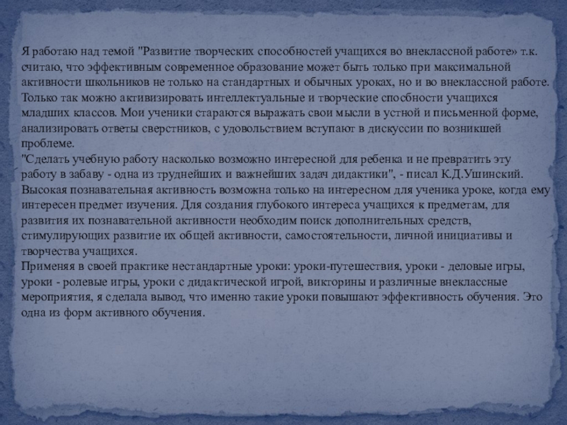 "Сделать учебную работу насколько возможно интересной для ребенка и не превратить эту работу в забаву - одна из труднейших и важнейших задач дидактики", - писaл К.Д.Ушинский. Высокая познавательная активность возможна только на интересном для ученика уроке, когда ему интересен предмет изучения. Для создания глубокого интереса учащихся к предметам, для развития их познавательной активности необходим поиск дополнительных средств, стимулирующих развитие их общей активности, самостоятельности, личной инициативы и творчества учaщихся.
