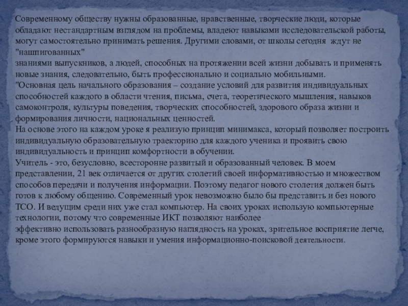 Учитель - это, безусловно, всесторонне развитый и образованный человек. В моем представлении, 21 век отличается от других столетий своей информативностью и множеством способов передачи и получения информации. Поэтому педагог нового столетия должен быть готов к любому общению. Современный урок невозможно было бы представить и без нового ТСО. И ведущим среди них уже стал компьютер. На своих уроках использую компьютерные технологии, потому что современные ИКТ позволяют наиболее